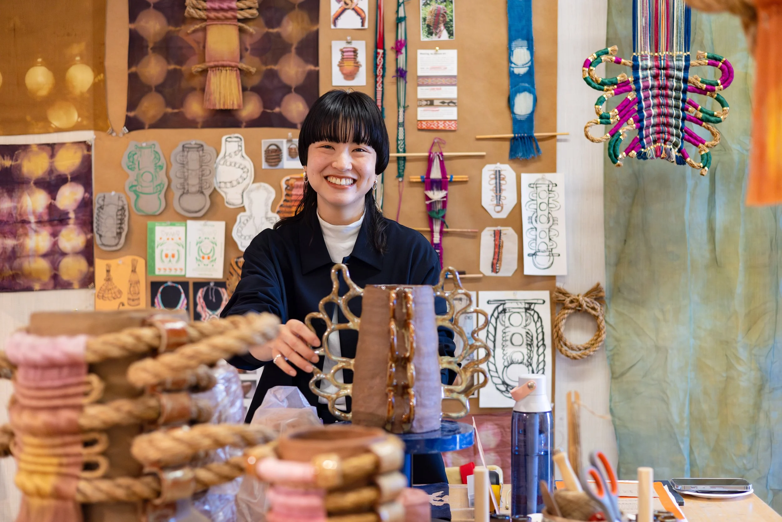 Terumi Saito (b. Shizuoka, Japan) is a New York-based Japanese sculptor and designer who interweaves fiber art and ceramics. Saito’s work reimagines the traditional backstrap weaving technique, incorporating natural dyes and hand-built ceramics to expand and push the boundaries of these mediums. Her practice reflects a dedication to preserving tradition through a contemporary lens, exploring the intersections of past and present, tradition and innovation. With each creation, she seeks to demonstrate the transformative power of art to connect, inspire, and elevate the human experience.